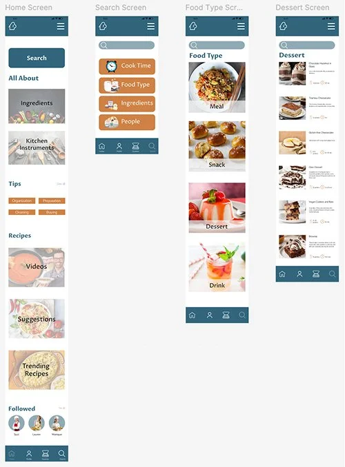 The process began with market and competitor research to understand existing food and recipe apps. Ideation included developing a logo, creating a mood board, and exploring multiple rounds of sketches. From there, the strongest ideas were refined into visual designs and interface templates. After gathering feedback, I made improvements and continued refining the layout and user flow. Once the final direction was set, I built a functional prototype and created mockups to present a clear and realistic vision of the app.